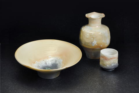 磁土のみを使った焼締。釉薬は掛けていないが、木炭と磁土が反応し光沢がかかった景色がでる。薄く肌理が滑らかであることも土物との違い。洗練された印象が特徴。