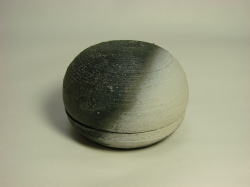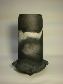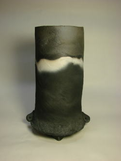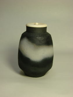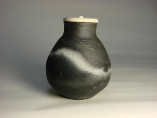 黒と白のコントラストで静かな趣を表現している。北米原住民族の焼成方法からヒントを得てガス窯で焼成を試みた。実用に耐えうる様、粘土や焼成に工夫してある。肌理はマットであり、手に取った感触が独特である。