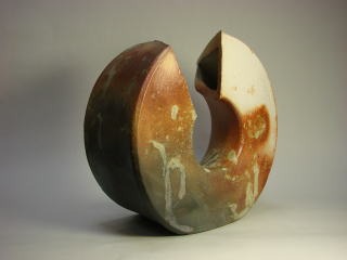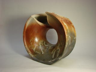 木炭と一緒に窯詰めして焼き締めた作品。非常に肌理細かい粘土であり、深みある緋色が出る。